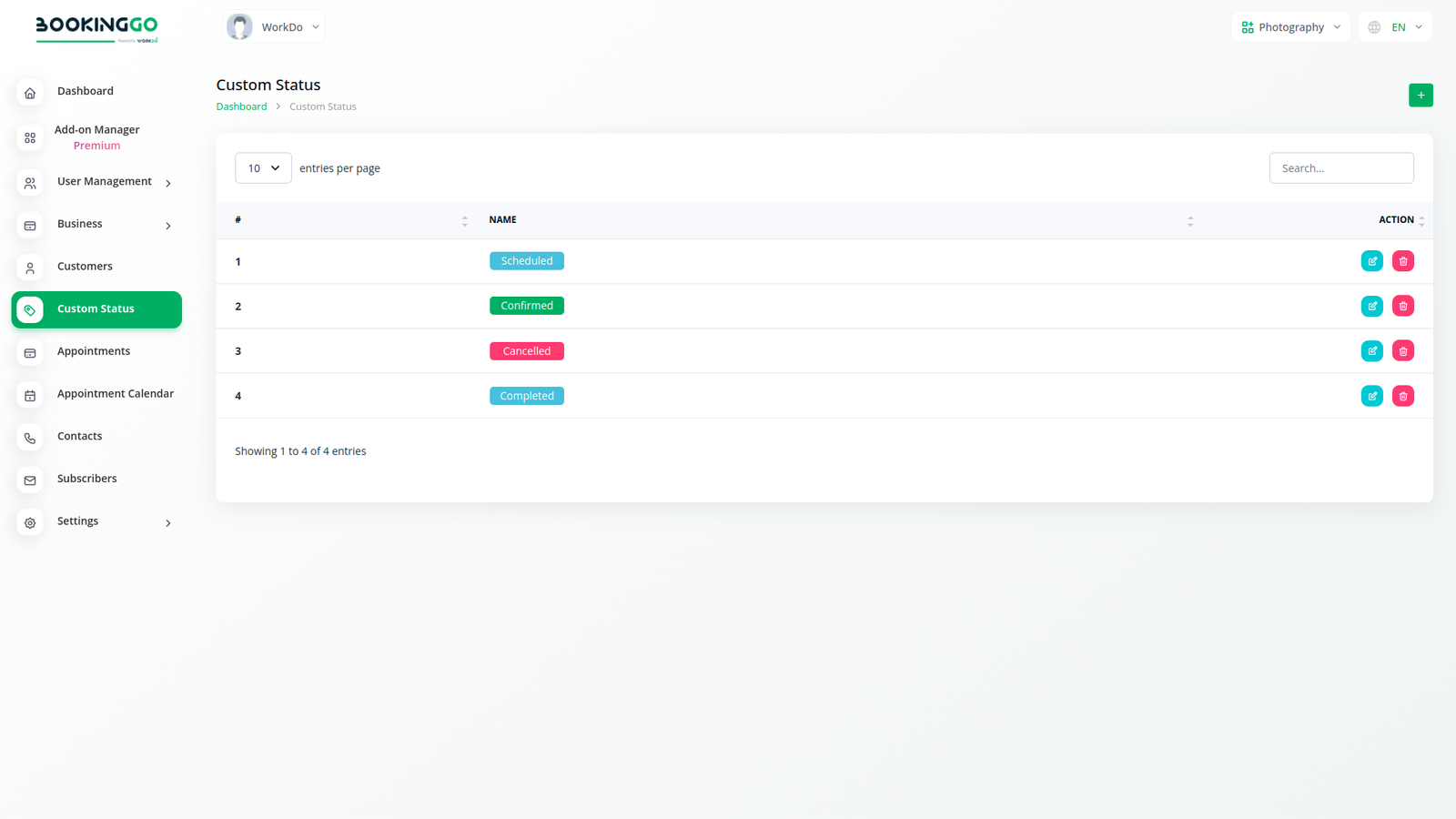 The Custom Status module within BookingGo SaaS offers administrators the ability to tailor appointment statuses to suit unique business workflows and requirements, providing enhanced clarity and efficiency in appointment management.